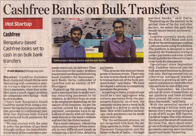 Cashfree Payments was launched in 2015 as a payment gateway. While operating the payment gateway, the founders, Akash and Reeju, found it difficult to use online bank portals for disbursing payments everyday. In mid-2016, Cashfree Payments decided to work on building a dedicated bulk Payouts solution for businesses operating in India.