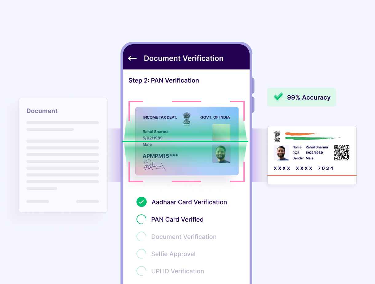 Authenticate users by quickly and accurately verifying their official documents, including Aadhaar, PAN, DL, Voter ID, and Passport.