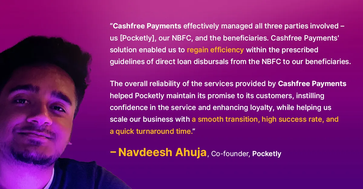 Pocketly is a lending service provider (LSP) and has multiple partner NBFCs who act as lenders. To ensure a seamless customer experience and boost customer loyalty, Pocketly partnered with Cashfree Payments, India’s leading payments and API banking solutions company, to overcome guidelines challenges and transform their loan disbursal processes compliantly.