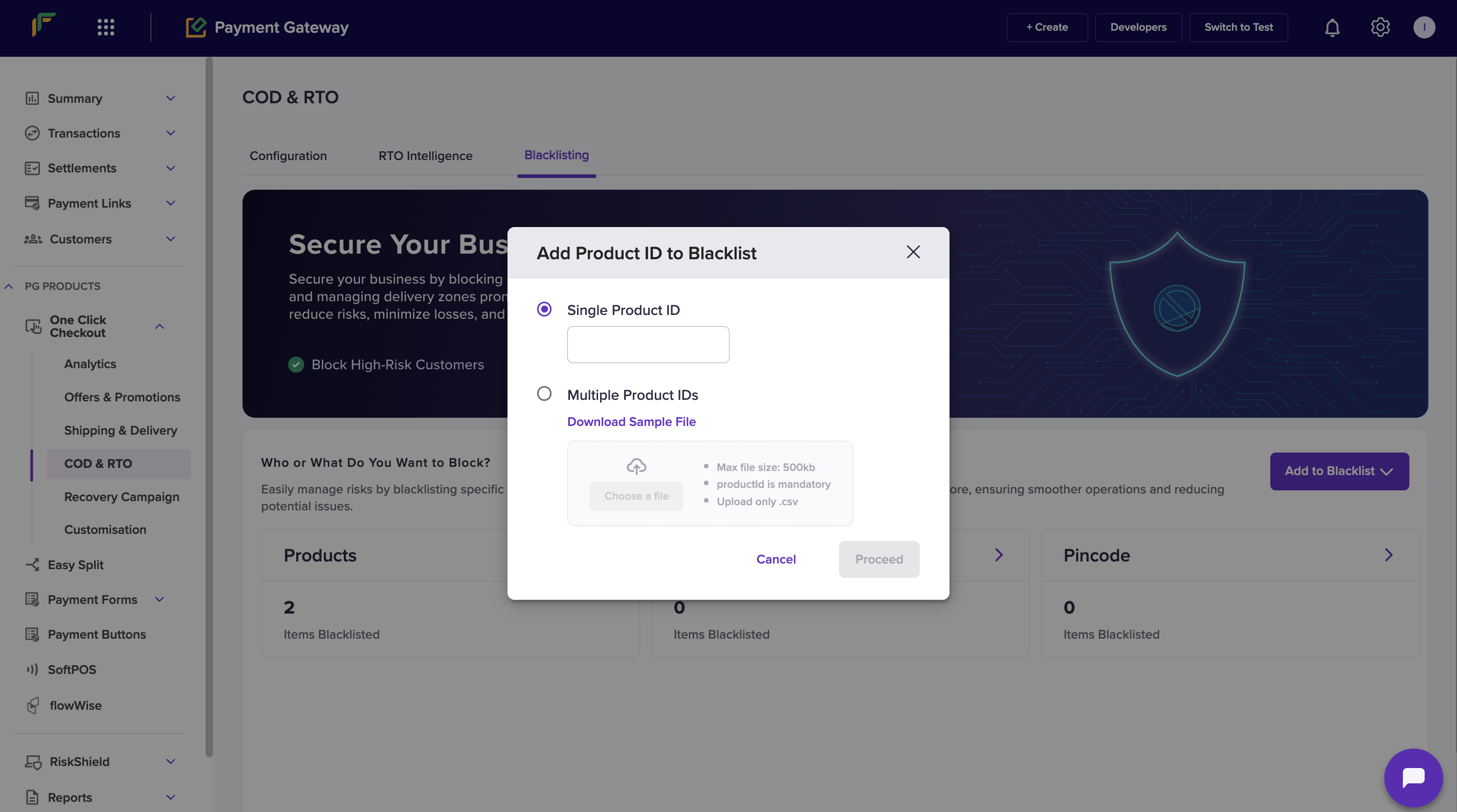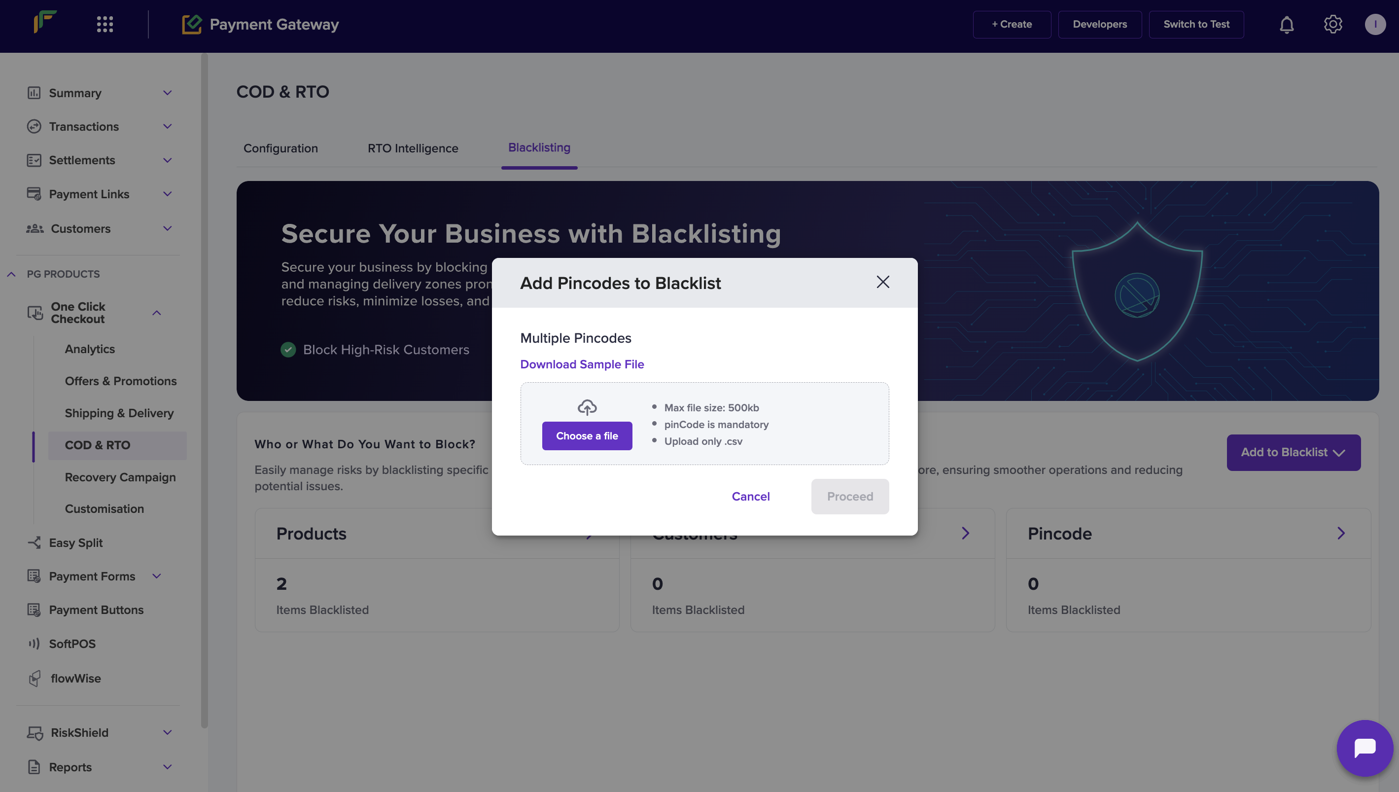 Use the Blacklist feature to restrict Cash on Delivery (COD) based on products, customers, or pincodes.To access the Blacklist: