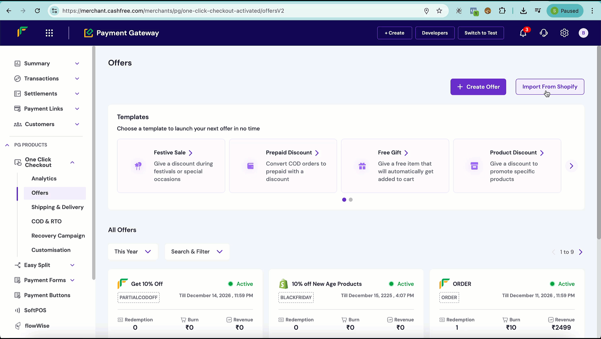 If you are using Shopify, you can import existing discounts directly into the Cashfree Offers Engine to synchronise them with your checkout page.- Log in to the Merchant Dashboard.