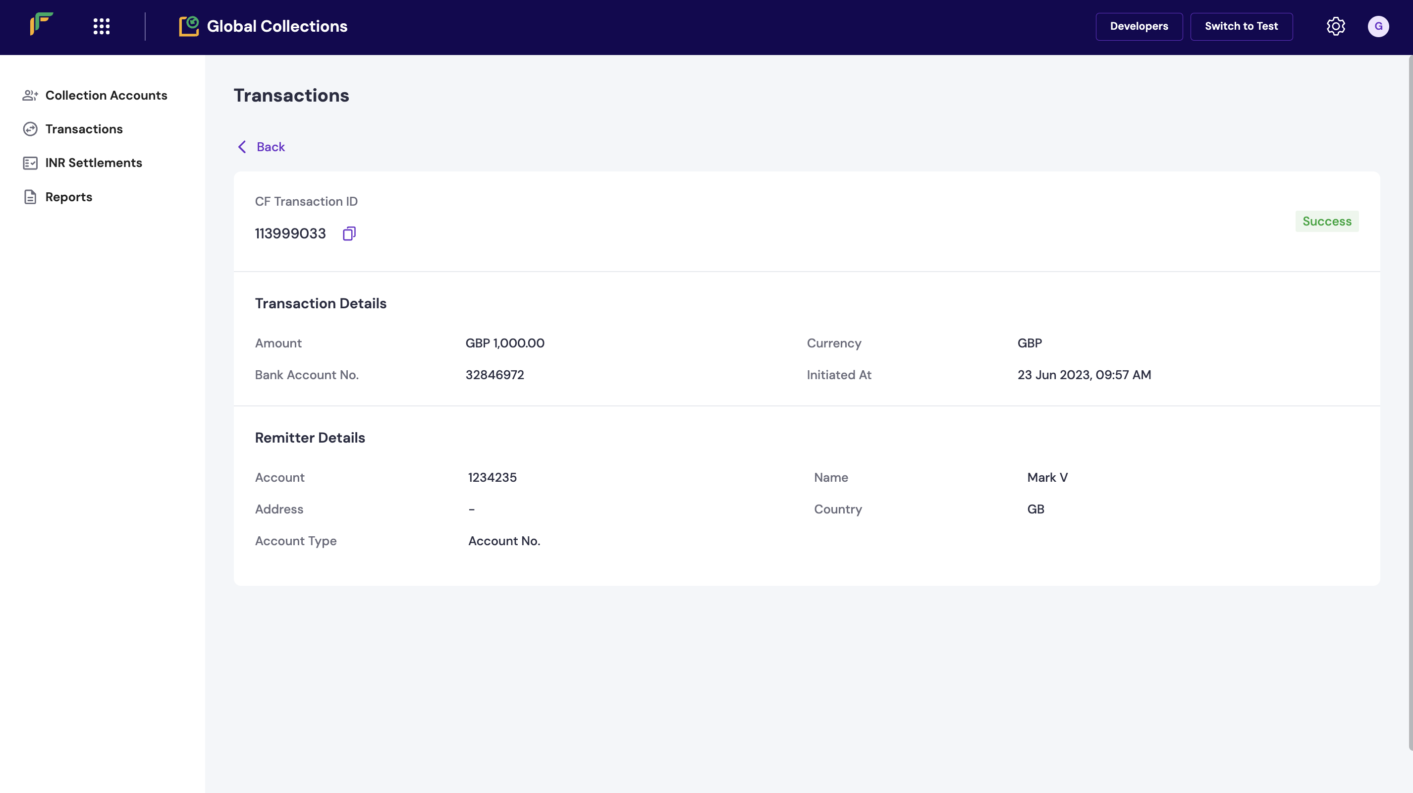 Click on a transaction to view the complete details of the transaction along with the remitter details.