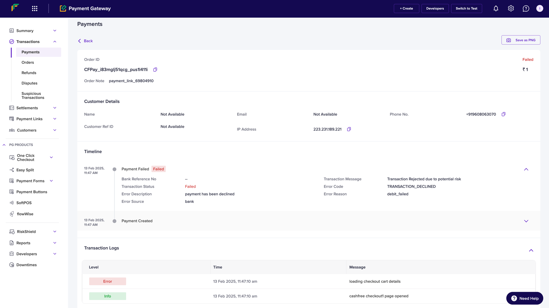 - Transaction Message: A message explaining the reason for transaction rejection, such as Transaction Rejected due to potential risk.