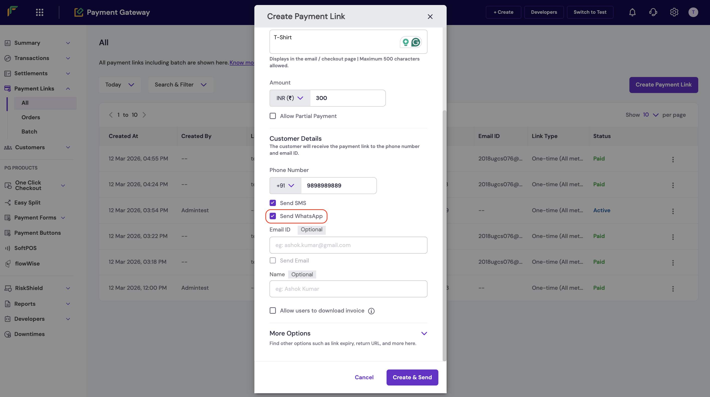 Follow these steps to send a payment link via WhatsApp using the Merchant Dashboard: