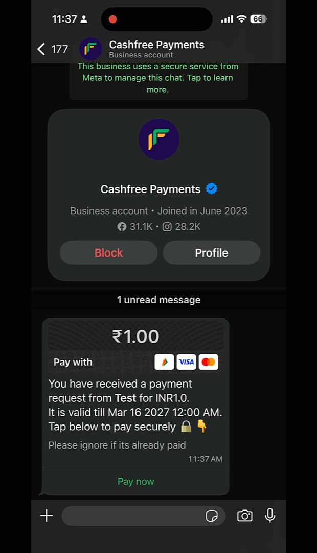 When you create a payment link and enable WhatsApp notifications, Cashfree sends the payment link to your customer as an interactive widget in WhatsApp. The widget displays the payment details and includes a Pay Now button, so customers can complete the transaction without leaving the app.