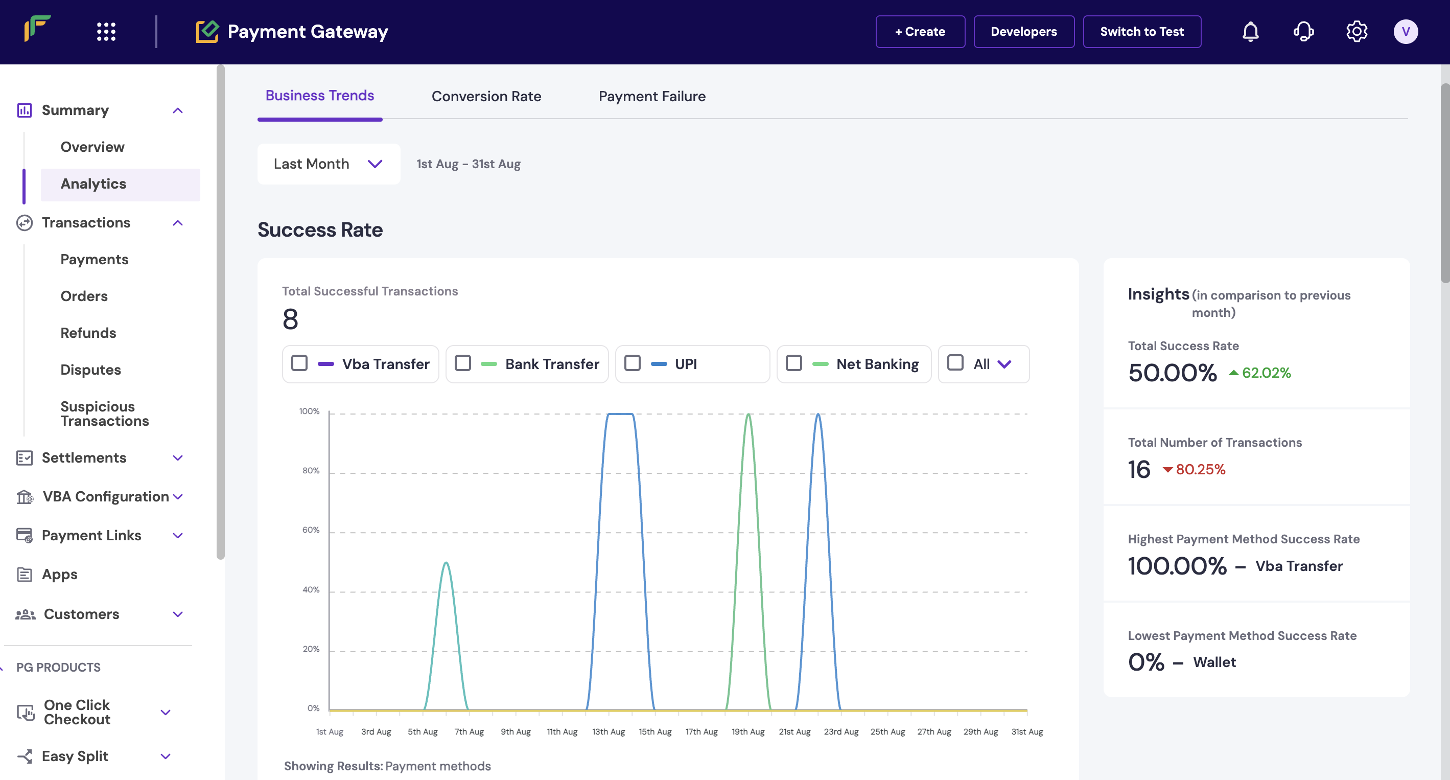 - Go to Payment Gateway > Transactions > Analytics.