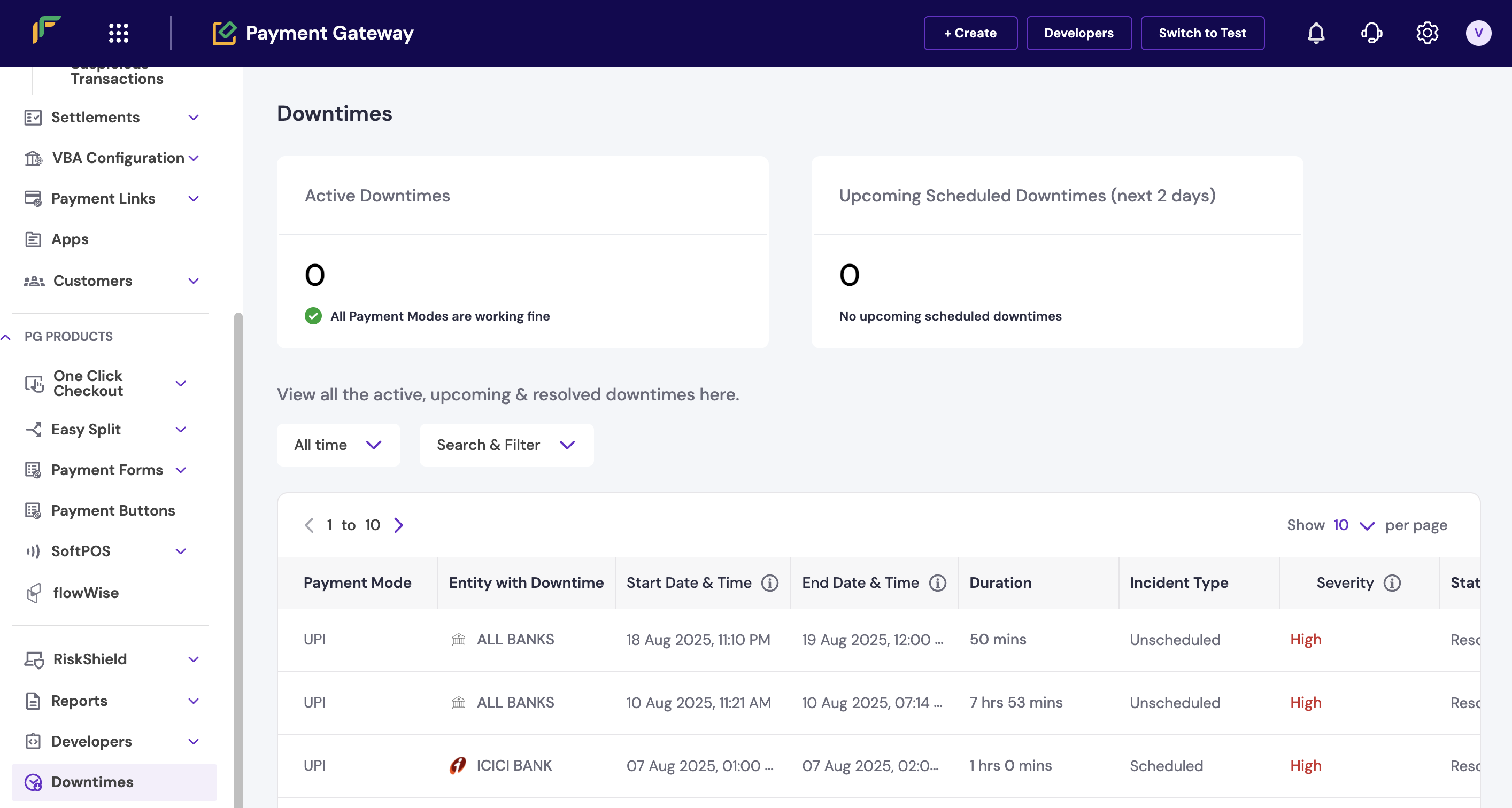 - Check downtime status: Review the downtime section to identify any active bank or network issues affecting payments.