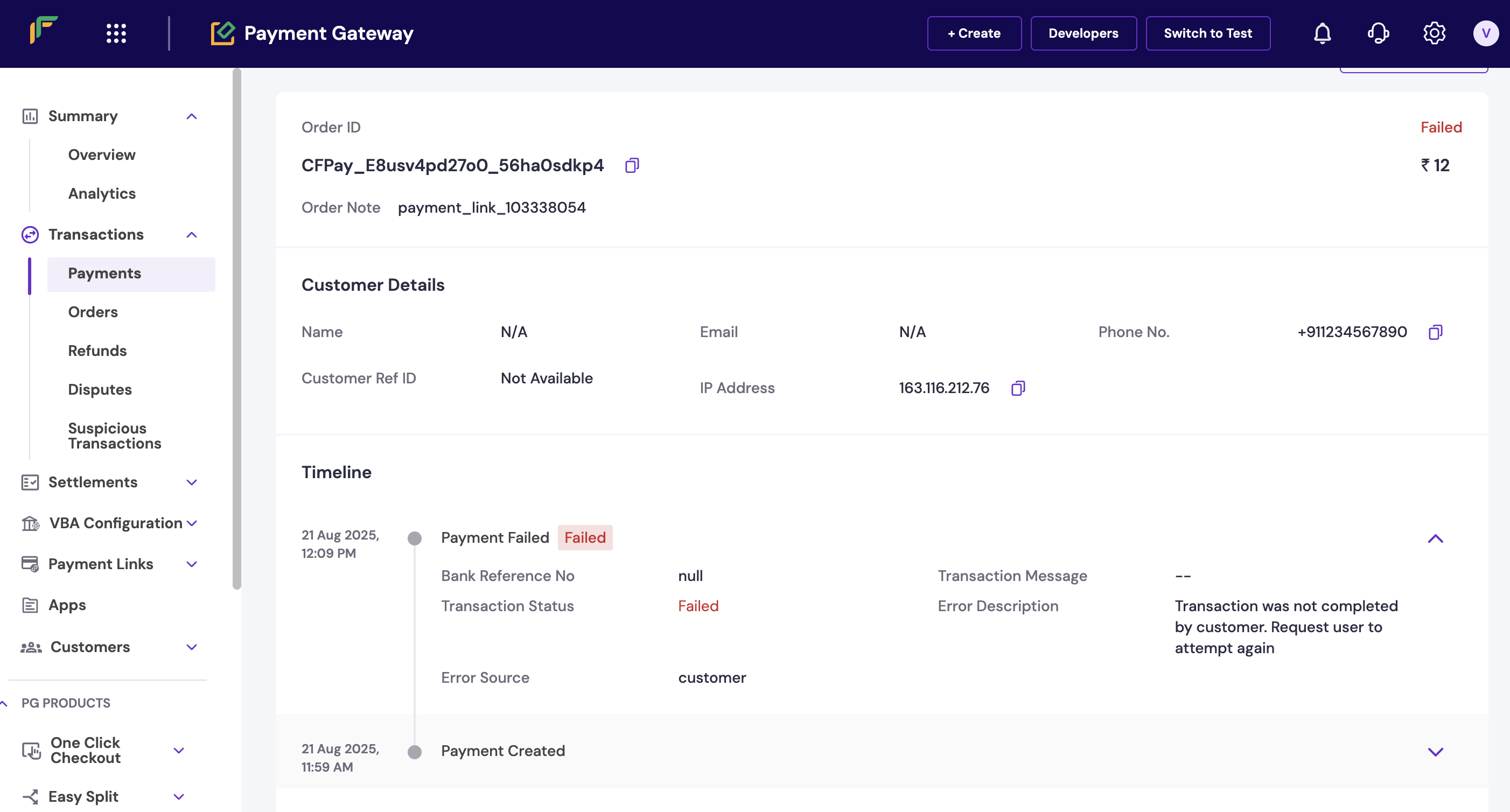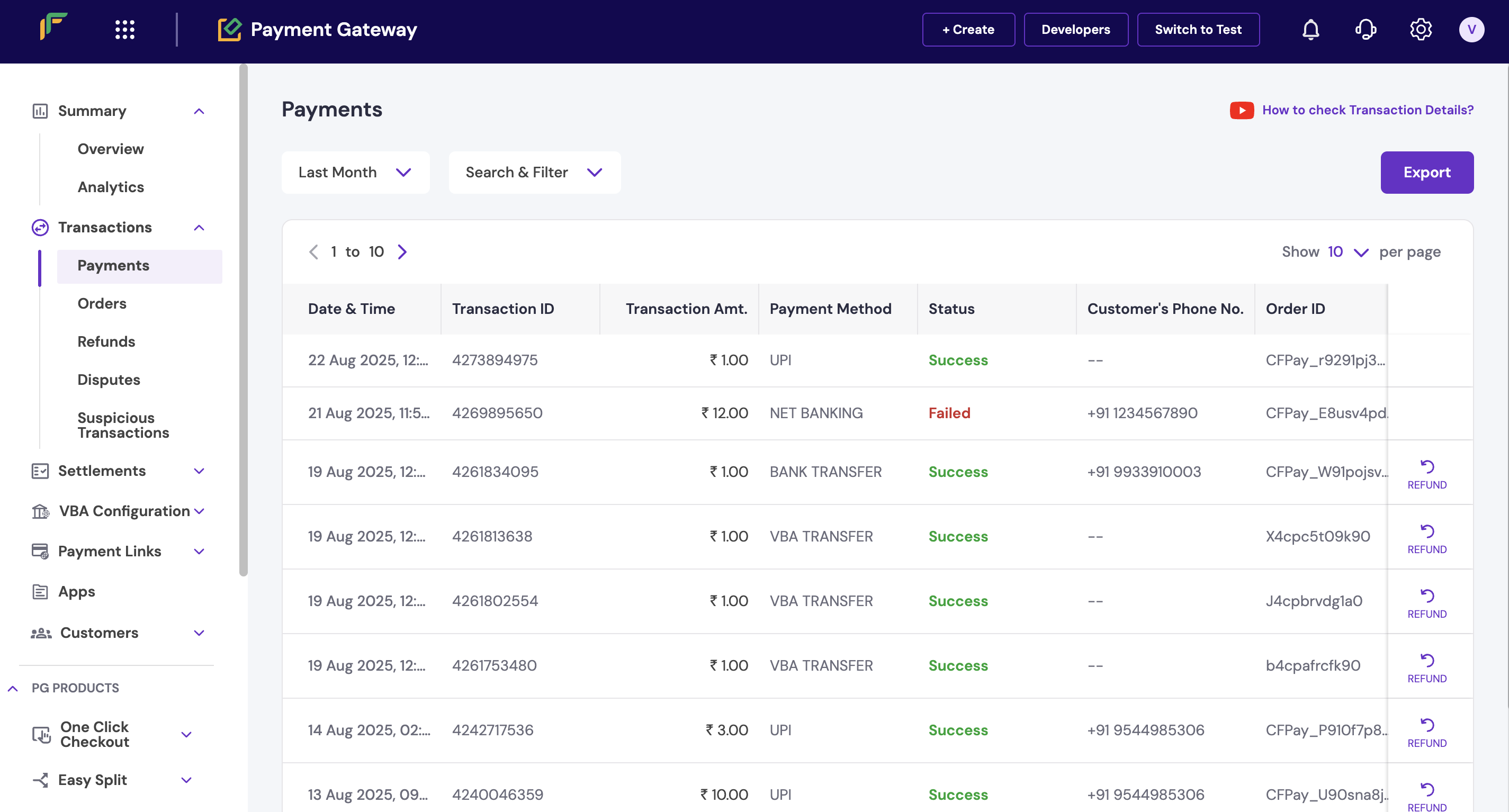 You can track whether a transaction was successful or failed directly from the dashboard. Complete these steps to check transaction status and failure reasons: