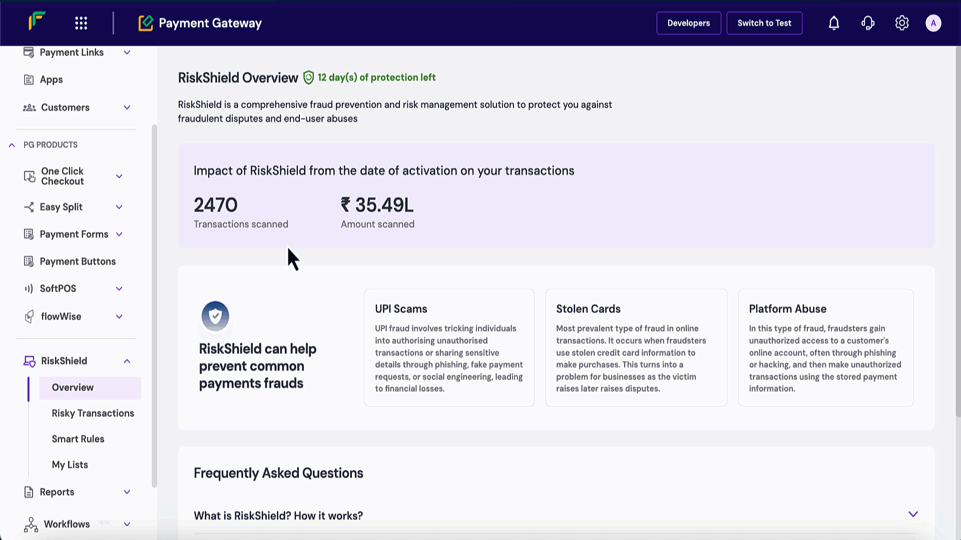 - Flag further transactions: The transaction is processed like any regular transaction, and the merchant receives settlement as usual. However, the transaction is highlighted in the Risky Transactions section of RiskShield for monitoring and review.