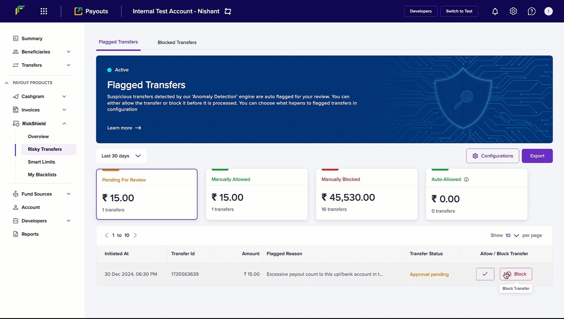 - Smart Rules: Breach of velocity-based limits on transfer amount or count, or violation of downtime schedules configured by the merchant.