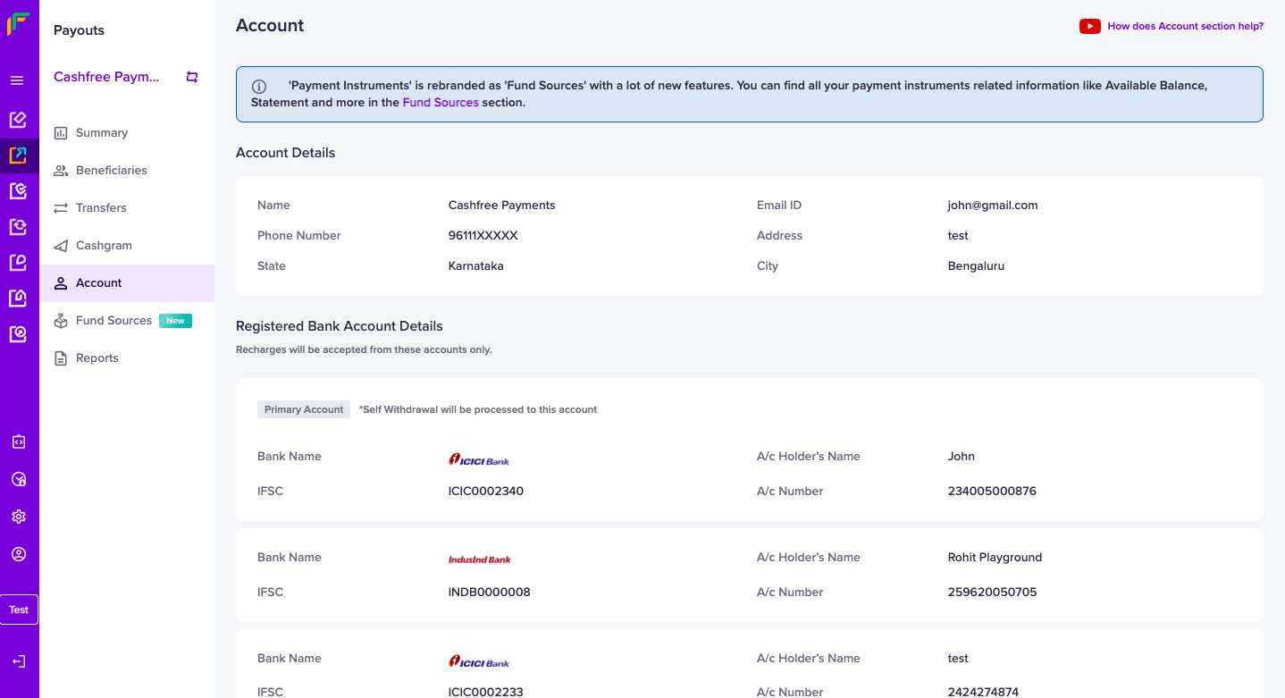 Your account details registered with Cashfree Payments display in the Account Information section, along with the bank account details that you use to add funds to your Cashfree Wallet. If you want to update any of the information shown in this section, please fill out the Support Form.
