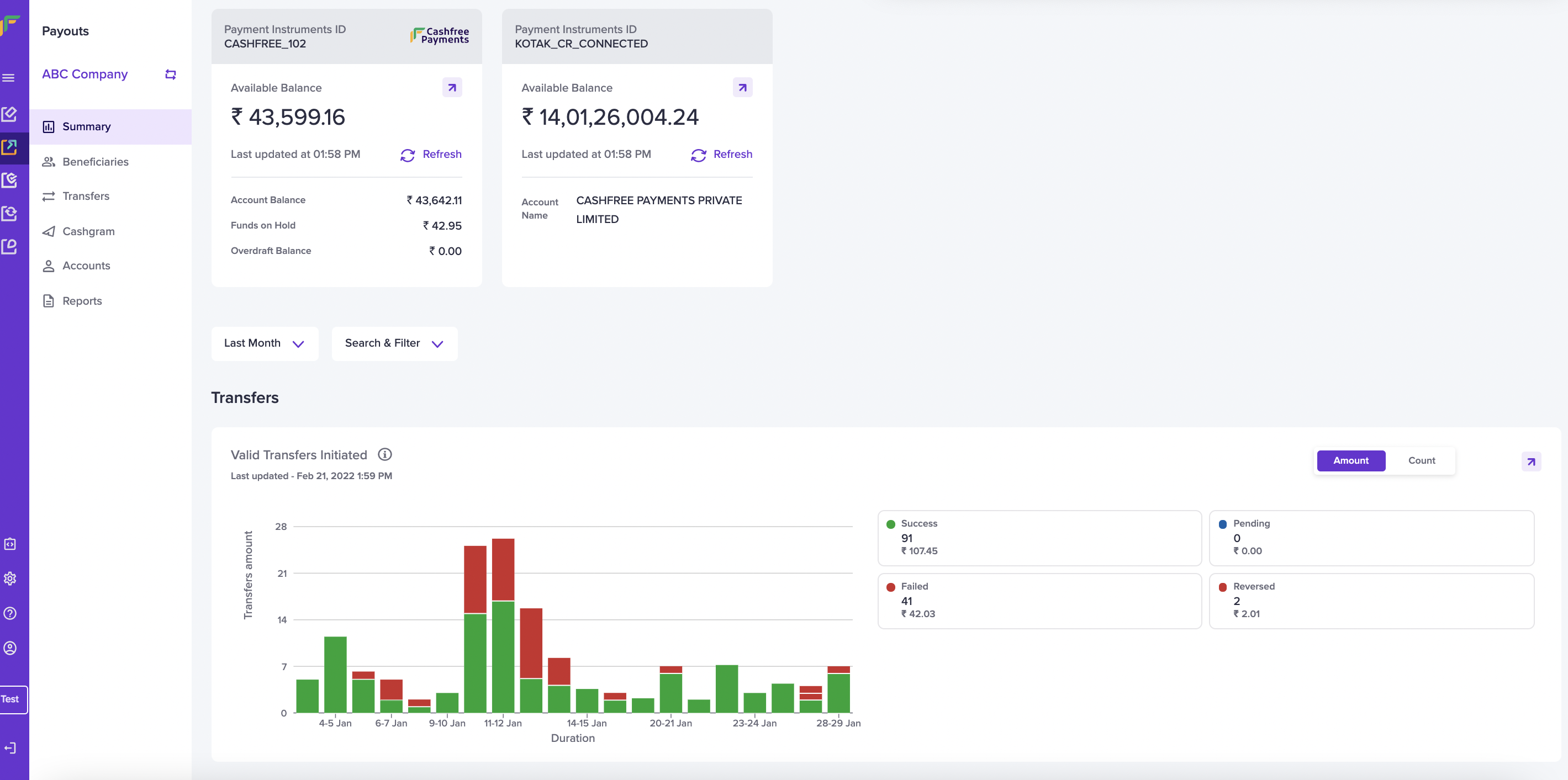 The Payouts Summary provides high-level insight into your payouts account. It gives you information about the balance available in your Cashfree Payments Payouts account and the amount transferred to beneficiaries. It also provides you with some statistics about your daily and weekly transfers. Information about success, pending, failed, and reversed transfers is also available. Overall, the Payouts Summary dashboard provides useful at-a-glance insight about the payout disbursals in your business.