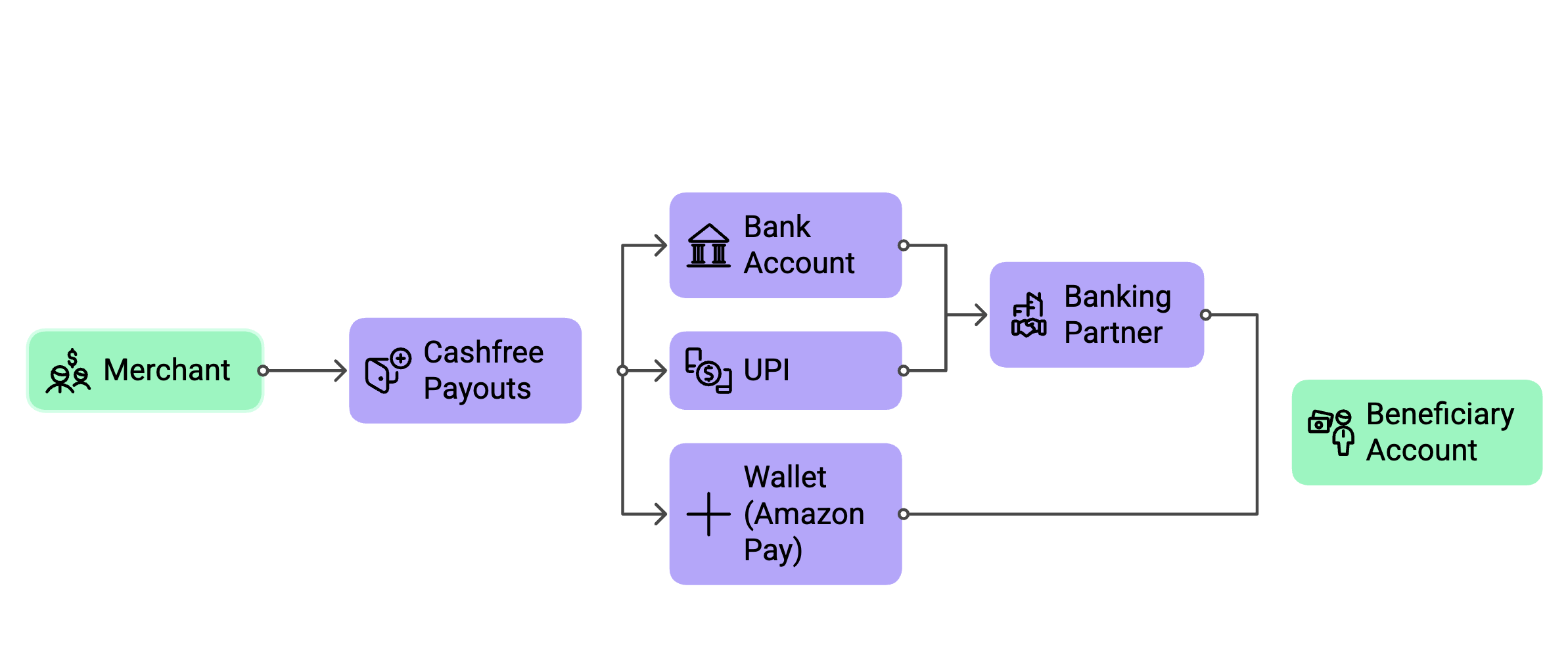 - Manage multiple payout methods: IMPS, NEFT, UPI, Mastercard (MoneySend), Visa (Visa Direct), and digital wallets (Amazon Pay and Paytm).