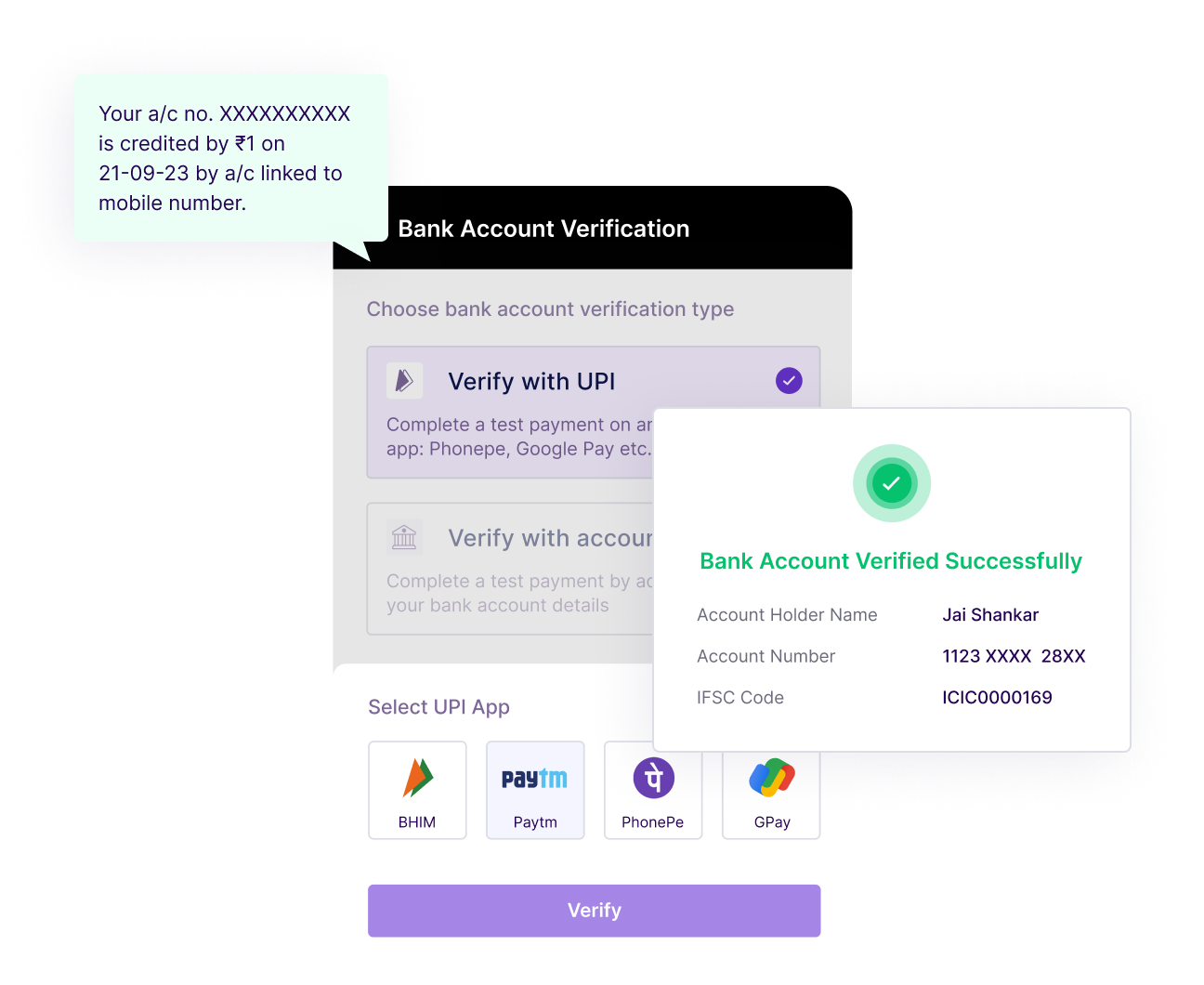 Use API to let your users verify their bank account at time of onboarding KYC or before receiving payouts. Know if the account is active, name as per bank records, and supported transfer modes.